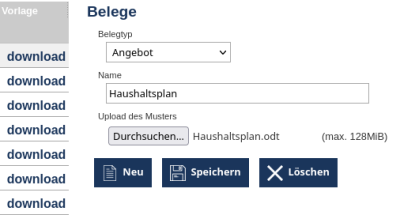 Wenn Sie ”Durchsuchen“ drücken können Sie eine .odt Datei wählen, die Sie als Belegmuster nutzen wollen, wenn Sie keine .odt Datei haben können Sie ganz einfach eine in Libre/Open Office erstellen.